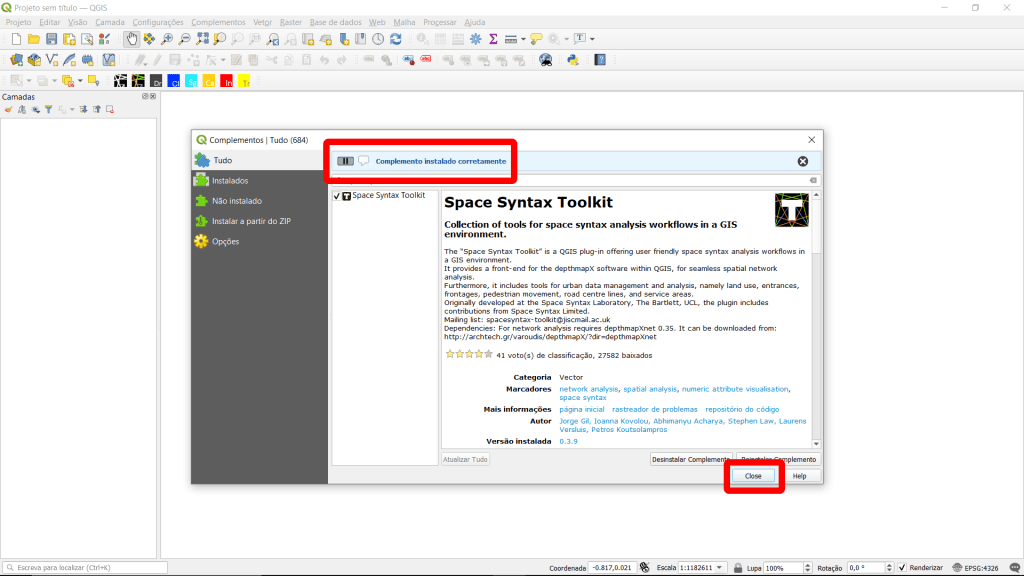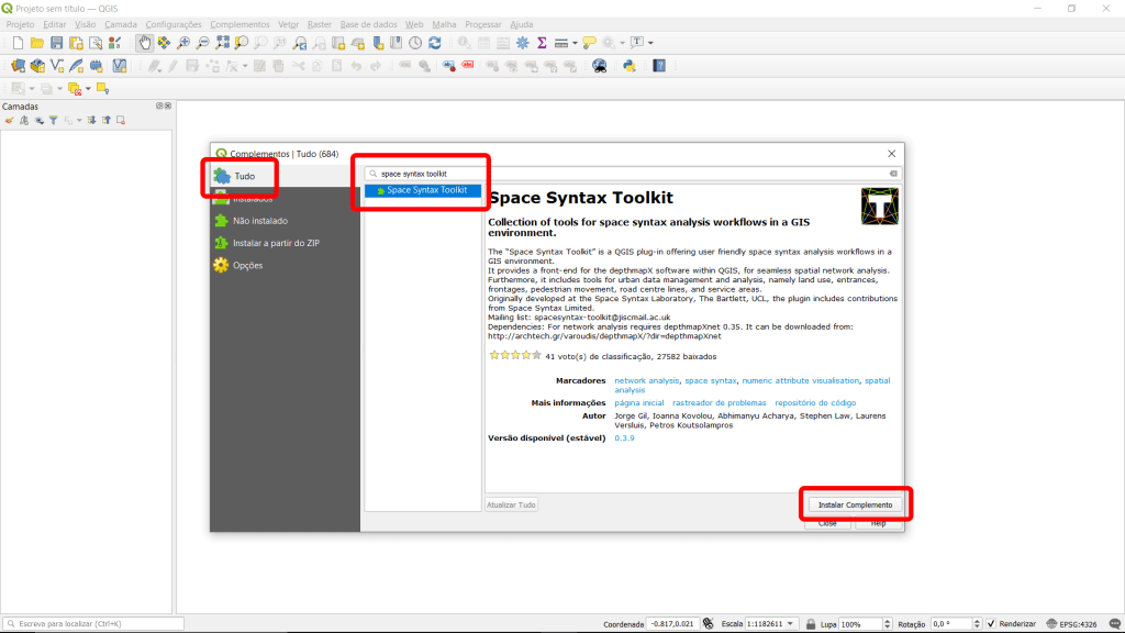 Uma nova tela irá aparecer. Clique na aba “tudo” e, na aba de pesquisa, digite “space syntax toolkit”. Clique no complemento que aparecer. No canto inferior direito desta tela, clique em “Instalar Complemento”