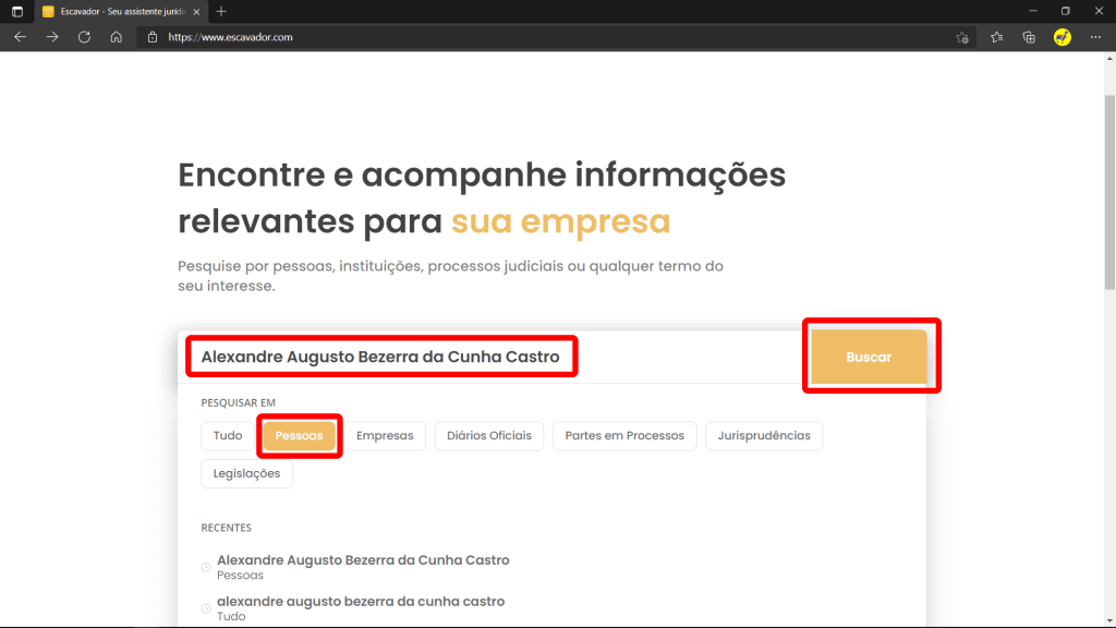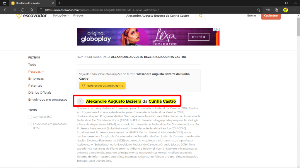 O Escavador (https://www.escavador.com/) é um site que surgiu no final de 2014, com a finalidade de dar mais transparência a dados públicos. Atualmente, é possível encontrar Currículos Lattes, Diários Oficiais, banco de patentes do INPI (Instituto Nacional da Propriedade Industrial) e sistemas de tribunais do Judiciário. Com a possibilidade de encontrar Currículos Lattes, pode-se recuperar o máximo de dados possíveis.