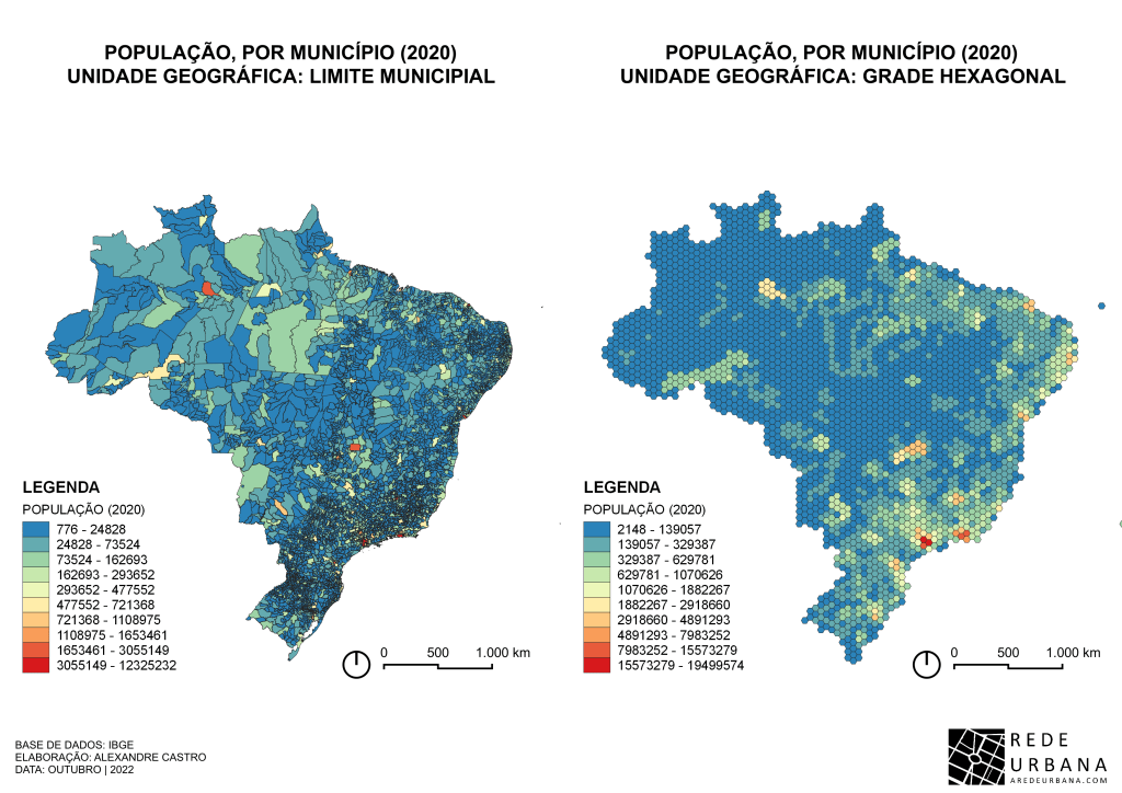 No exemplo abaixo, perca como é difícil identificar as cores que representam a população dos municípios mais próximos ao litoral, pelo fato de usas áreas serem menores. Ao transformar os dados em mapa hexagonal, apesar de algumas distorções nos valores (visto que são somatórios de populações por hexágono, e não mais por limite municipal), é mais fácil de ler e interpretar os dados no mapa como um todo. Além disso, há a “normalização” dos valores mostrados, pois vão estar divididos na mesma escala espacial (de cada hexágono).