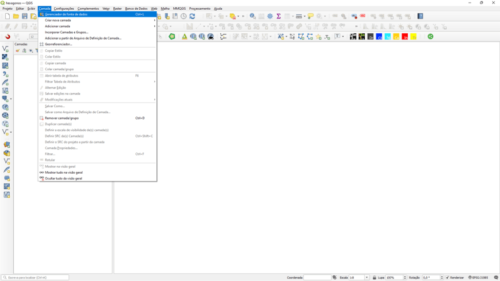 Para inserir novas camadas no seu projeto, clique em “Camada” > “Inserir “Gerenciador de fonte de dados”, ou utilize o atalho Ctrl + L. Opcionalmente, você pode inserir ícones de atalhos para facilitar a tarefa.
