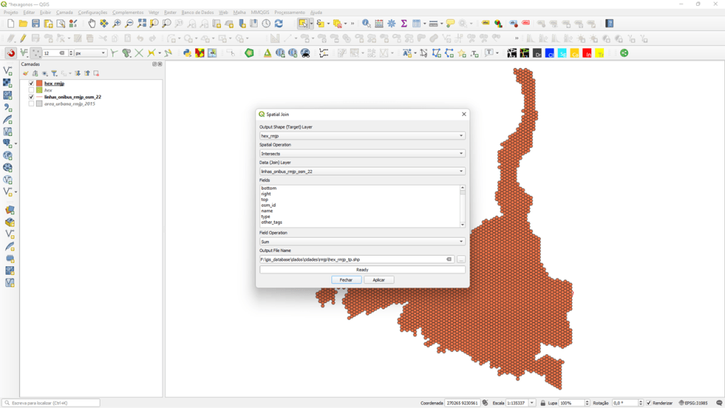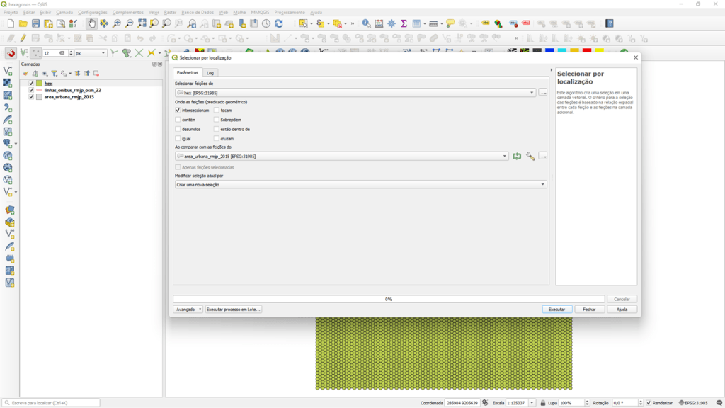 Em “Spatial Operation” clique em “Intersects“. Assim, o plugin vai computar cada linah de ônibus que interseccionar com cada hexágono da grade;