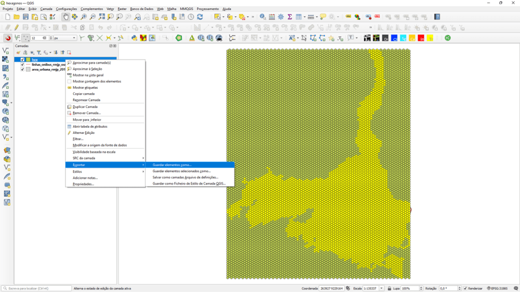 Agora salve esta seleção como uma nova camada. Clique com o botão direito na camada da grade hexagonal, e depois clique em “Exportar” > “Guardar elementos como…”