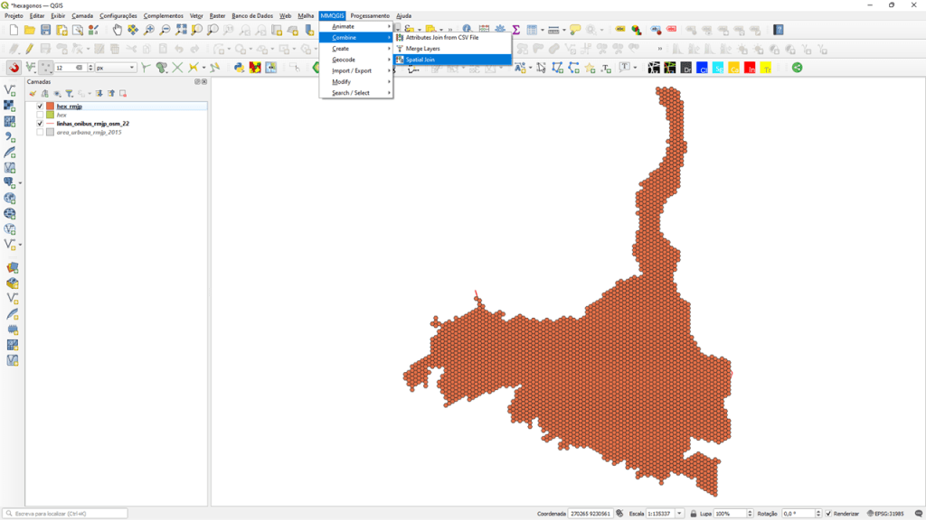 Agora é preciso inserir os dados que você quer na grade hexagonal. Para o exemplo, vamos calcular a quantidade de linhas de ônibus que passam por hexágono. Primeiro, deixe a camada da grade recortada e a camada que contém os dados a serem importados ativas, para que o plug-in MMQGIS possa identificá-las ao configurar o processamento. Agora, clique em “MMQGIS” > “Combine” > “Spatial Join”.