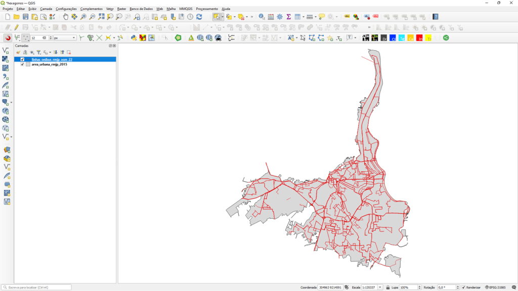 Para o exemplo, serão importadas as camadas de linhas de ônibus, obtidas no OpenStreetMap e a da área urbana da região metropolitana, modelada a partir da base de faces de logradouros do IBGE.