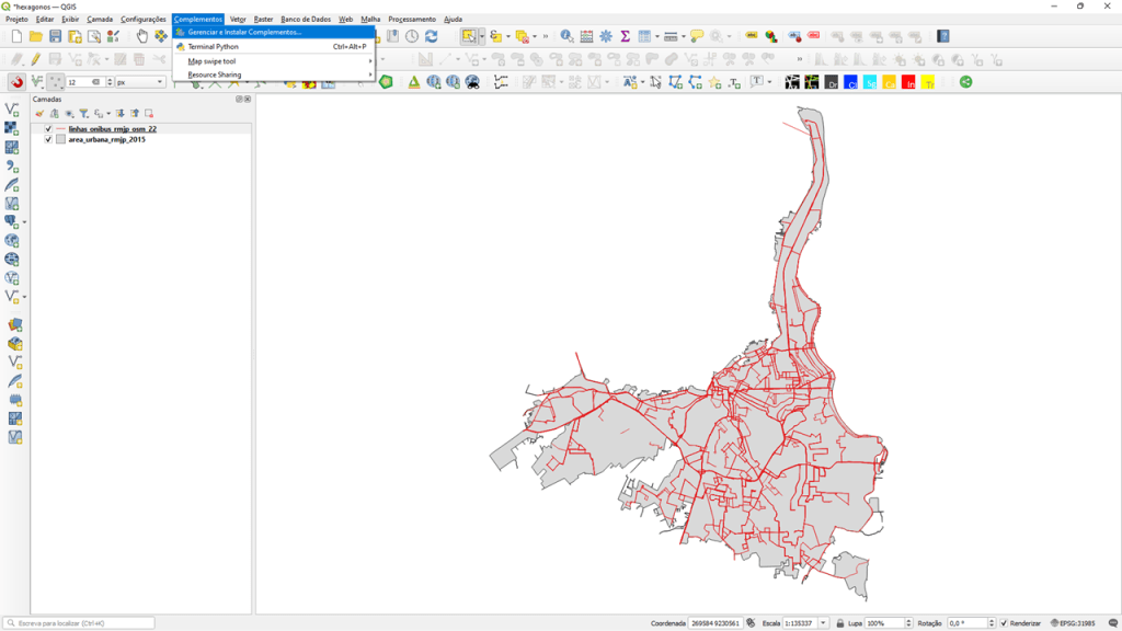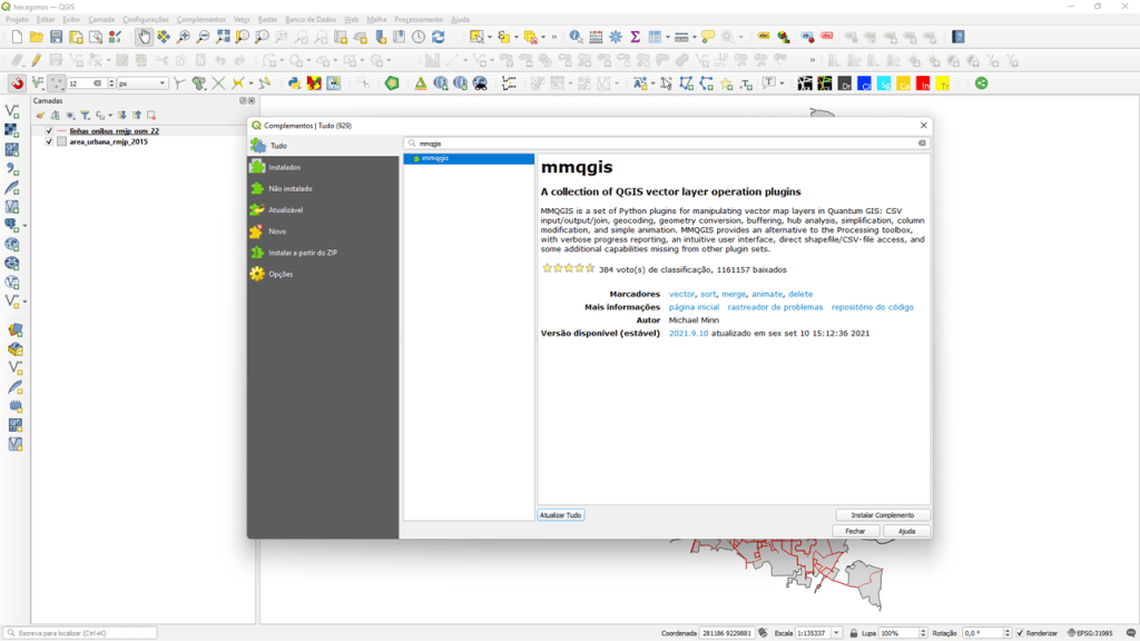 A grade hexagonal e a junção espacial de dados é feita pelo plug-in MMQGIS. Para instalá-lo, clique em “Complementos” > “Gerenciar e Instalar Complementos…”