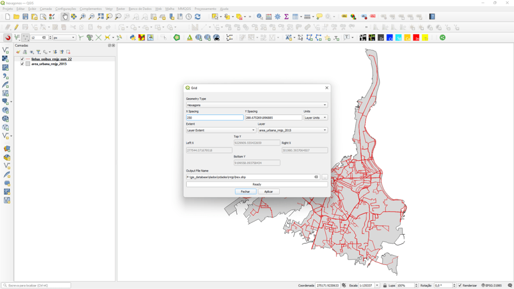 Em “X Spacing” e “Y Spacing“, defina o tamanho de cada célula hexagonal. Note que os valores são interdependentes, e o maior valor dos 2 será a distância do centroide entre hexágonos adjacentes. Não há um valor correto, pois isto depende da escala a ser trabalhada e o nível de detalhamento da informação que vai ser espacializada. Mas tenha em mente que uma grade com poucos hexágonos é processada mais rapidamente, mas pode simplificar demais a representação gráfica (o que pode gerar prejuízos para a qualidade dos dados); uma grade com muitos hexágonos, além de demorar demais o processamento, pode perder o efeito de simplificação das geometrias. Encontre um bom senso entre tamanho da célula e quantidade de dados. Neste exemplo, as células possuem 250 metros no valor x;