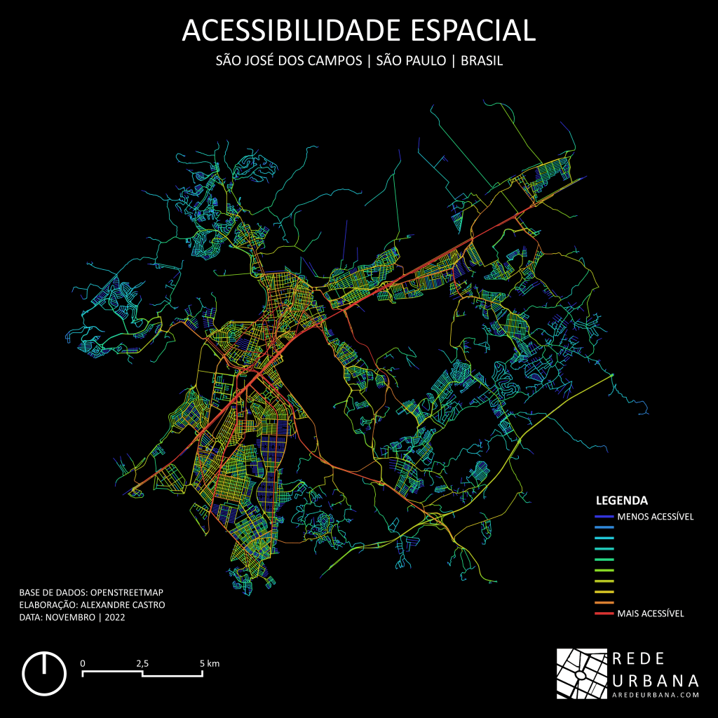 Estas medidas podem ser obtidas a partir da Sintaxe Espacial e da Análise Angular de Segmentos. A imagem abaixo mostra a acessibilidade espacial em escala urbana, ou seja, a facilidade de alcançar ou atravessar um ponto da cidade para outro.