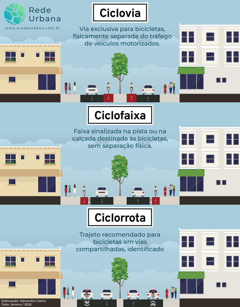 O diagrama abaixo resume as características e diferenças entre as ciclovias, ciclofaixas e ciclorrotas.